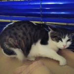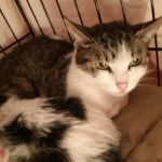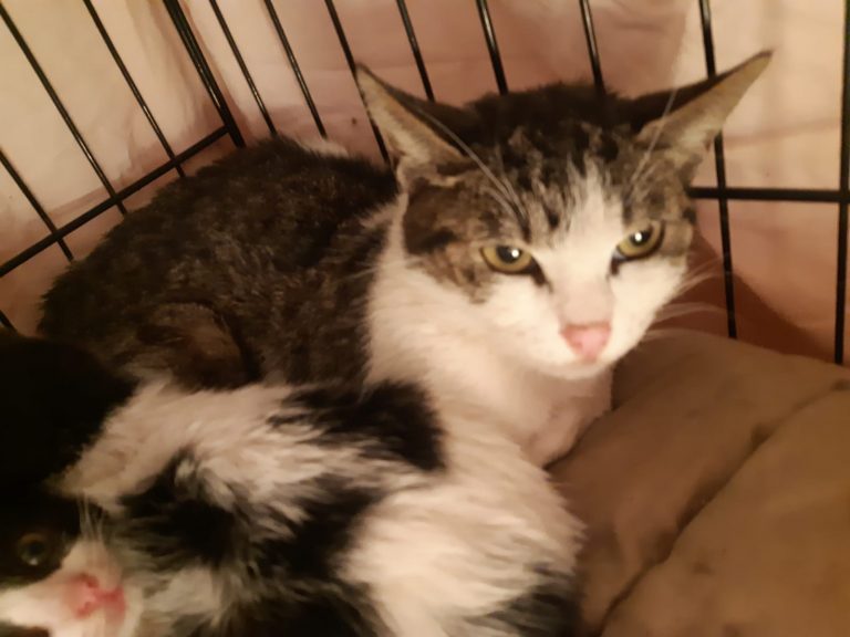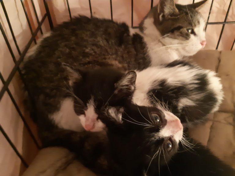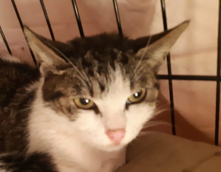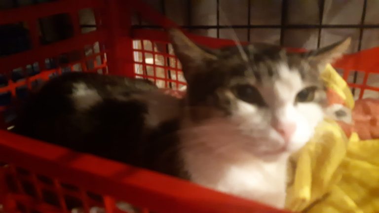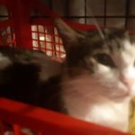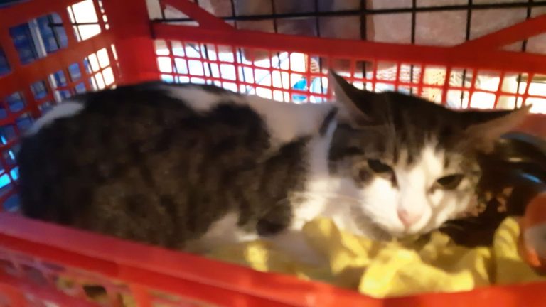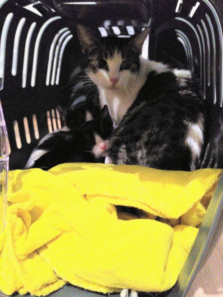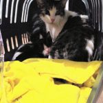 Elle a été trouvée il y a deux mois dans une usine de recyclage des déchets à Vitry, avec ses deux bébés Ambroise et Fadette. Elle a certainement passé plusieurs mois dehors car maintenant, elle a un peu peur de la main humaine. Ceci dit, elle n'est pas du tout agressive, ne griffe pas et ne mord pas.