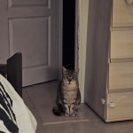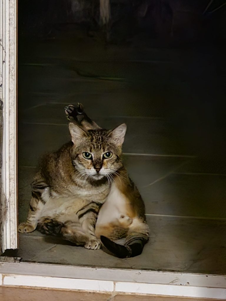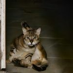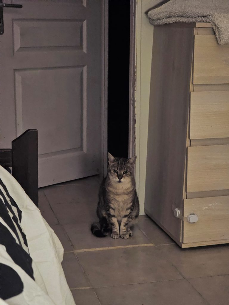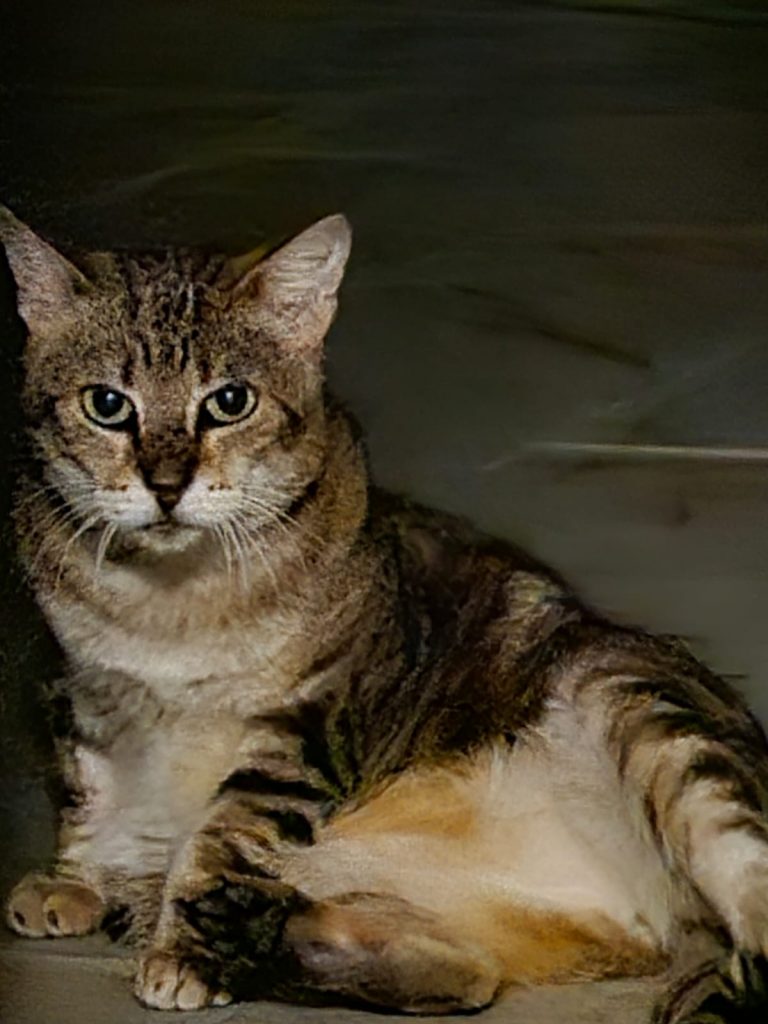 Ce grand chat tigré de 5 ans est très très peureux et craintif des humains. Il s’est beaucoup apaisé depuis qu'il est au Sanctuaire. Avant il fuyait dès qu'il me voyait, mais maintenant reste et fait sa vie tranquillement, ce qui m'a permis de le prendre enfin en photo. Il faut faire attention de ne pas lui faire peur, par exemple s'il nous faut attraper un autre chat devant lui, il peut se jeter sur une vitre ou une porte pour essayer de fuir...