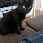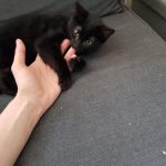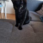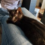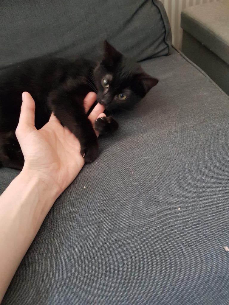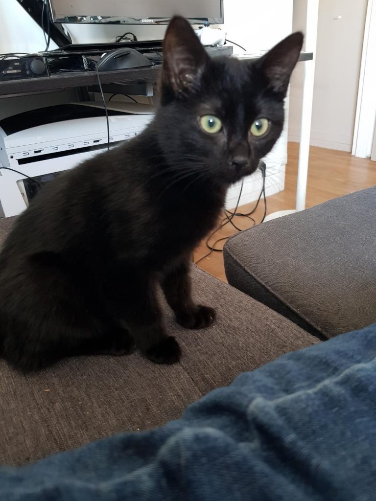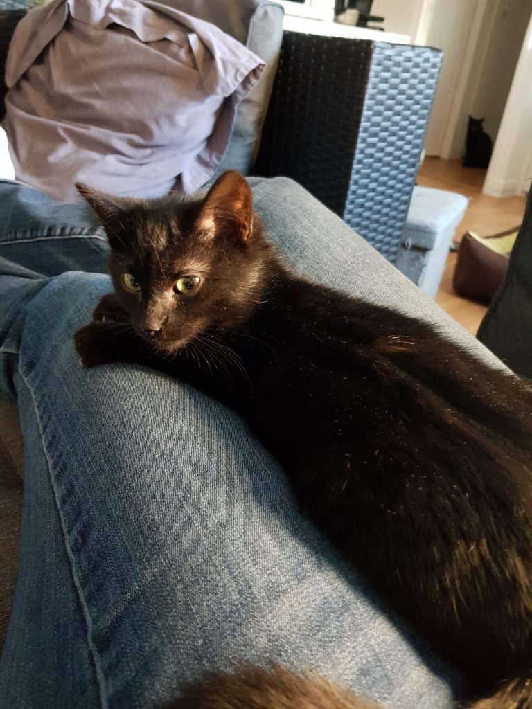 Chaperon rouge c'est la reine des câlins. Elle se frotte sur nos jambes, grimpe sur nos genoux dès qu'on s'asseoit et nous dort dessus dans des positions de pleine confiance. Si on la prend dans nos bras, elle se frotte la tête sur notre menton.