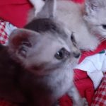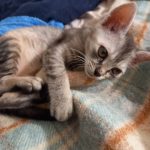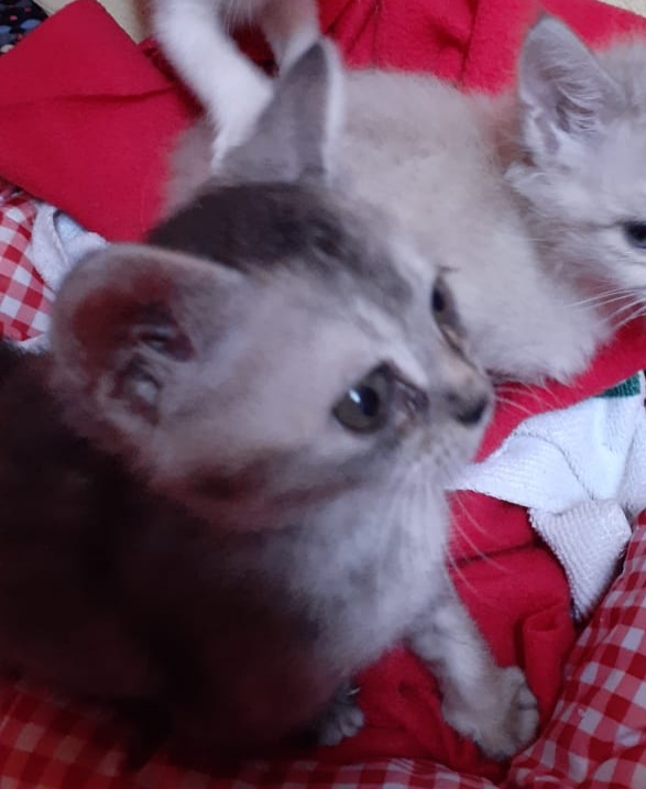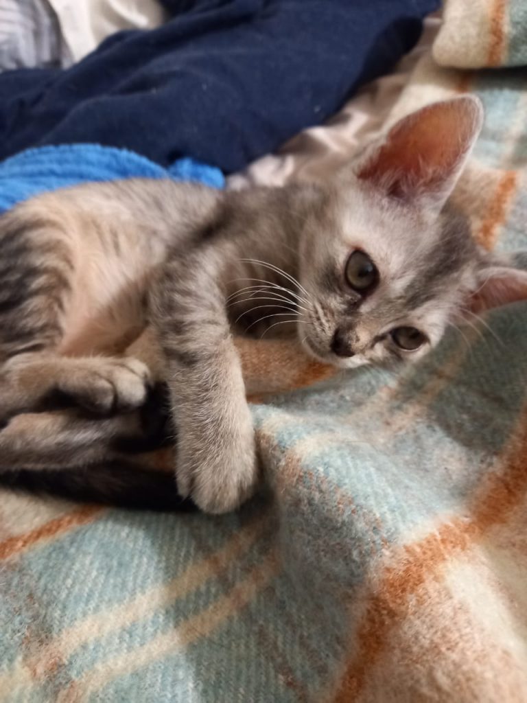 Petit bout de chat issue d'une fratrie de 6 bébés élevés par leur mère jusqu'à 3 semaines mais celle-ci , sauvage s'est sauvé par la fenêtre et ils ont finit leur sevrage au biberon . Ils sont de ce fait très proches des humains. C'est une petite poupée toute douce, calme et observatrice . Aime les câlins et jouer avec ses frères et sœurs.