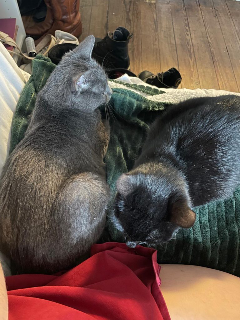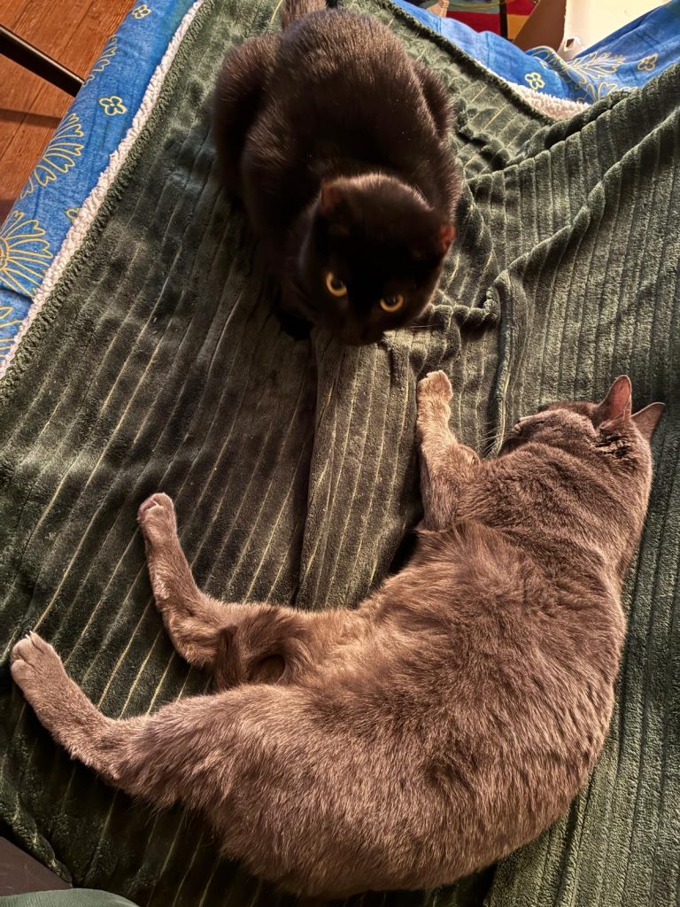Ces 2 soeurs sont de gentilles minettes dynamiques et joueuses . DESKO c'est la bleue douce et câline , POKI c'est la noire ,plus timide , il lui faudra un peu plus de temps pour prendre ses marques dans son nouveau foyer .