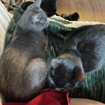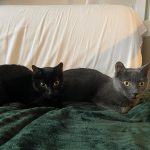 Ces 2 soeurs sont de gentilles minettes dynamiques et joueuses . DESKO c'est la bleue douce et câline , POKI c'est la noire ,plus timide , il lui faudra un peu plus de temps pour prendre ses marques dans son nouveau foyer .