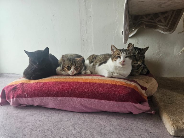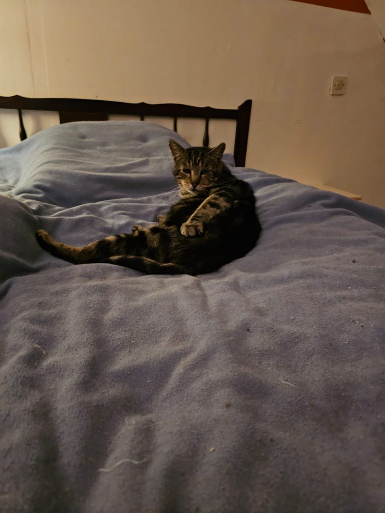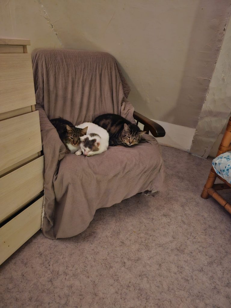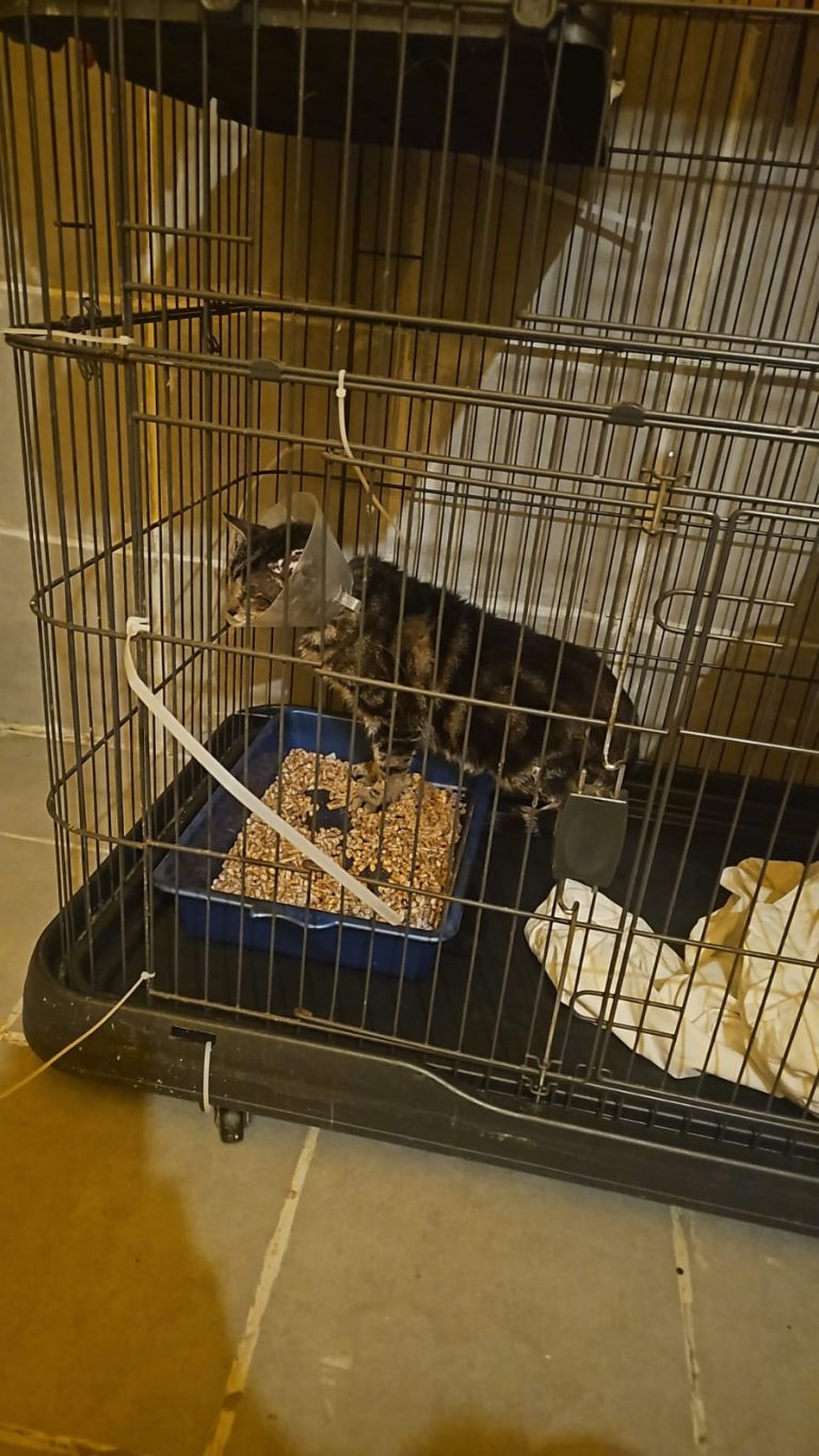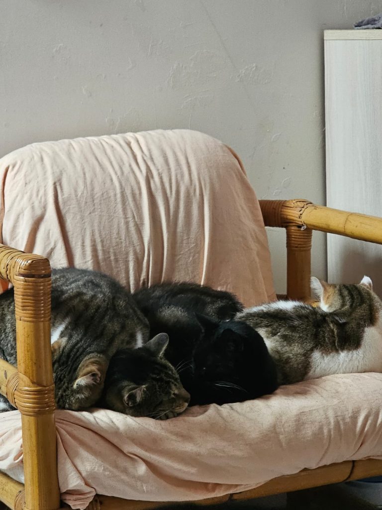 Nous l'avons pris en charge en 2021 dans le cadre d'une campagne de stérilisation des chats errants de la Cité des Sciences à Paris. Il est très craintif, ne laisse aucun humain l'approcher et c'est pour cela qu'il n'a jamais été adopté. Par contre il a pleins de copains chats, il les adore et les laisse même dormir sur lui. Il a des yeux très particuliers, qui lui donnent tout le temps un air endormi...