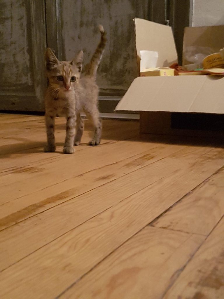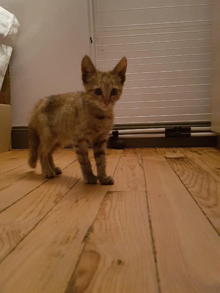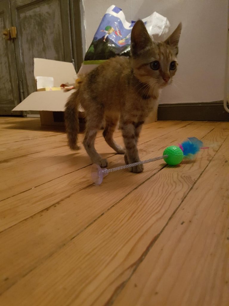 C'est une petite minette pleine de surprise. Alors qu'au début elle était très craintive et affamée, elle s'est finalement parfaitement sociabilisée et joue sans arrêt.