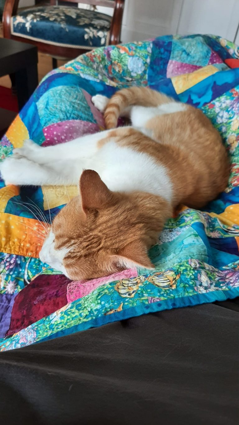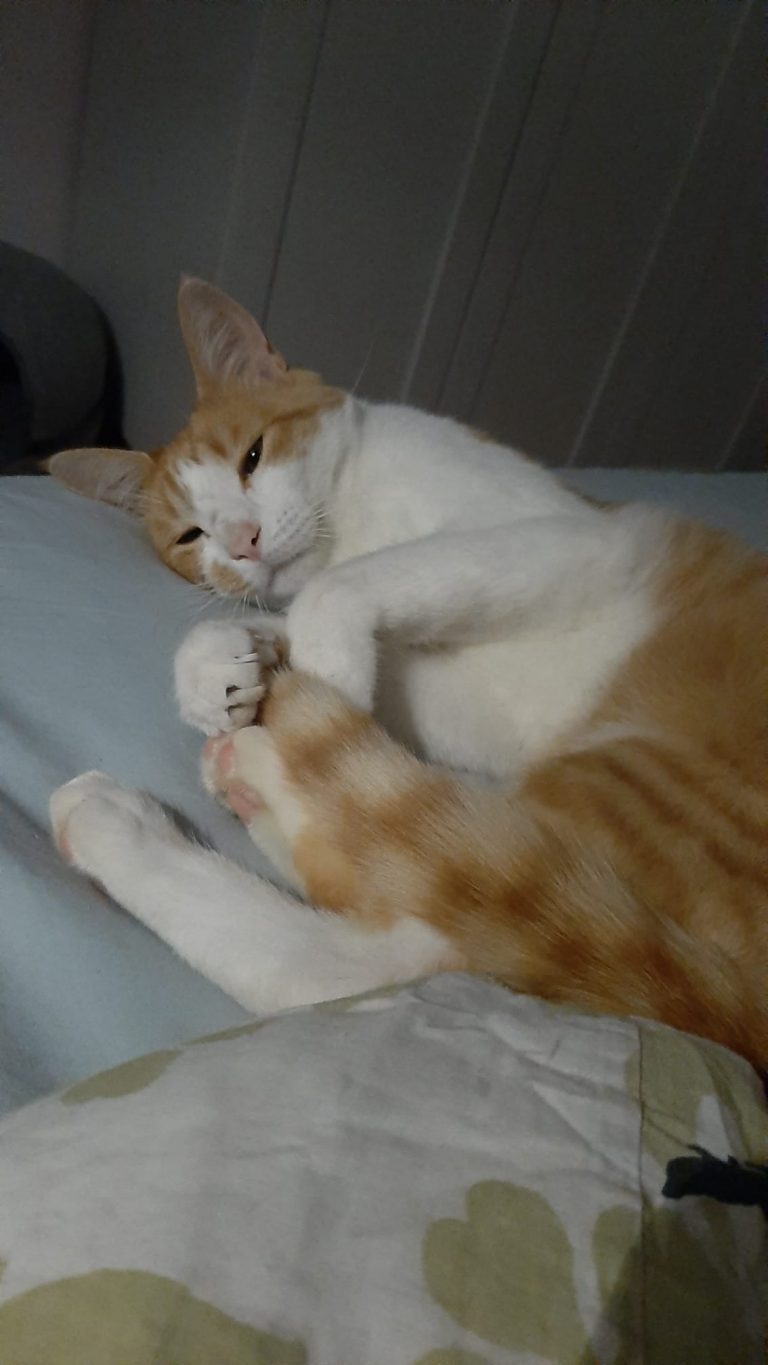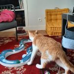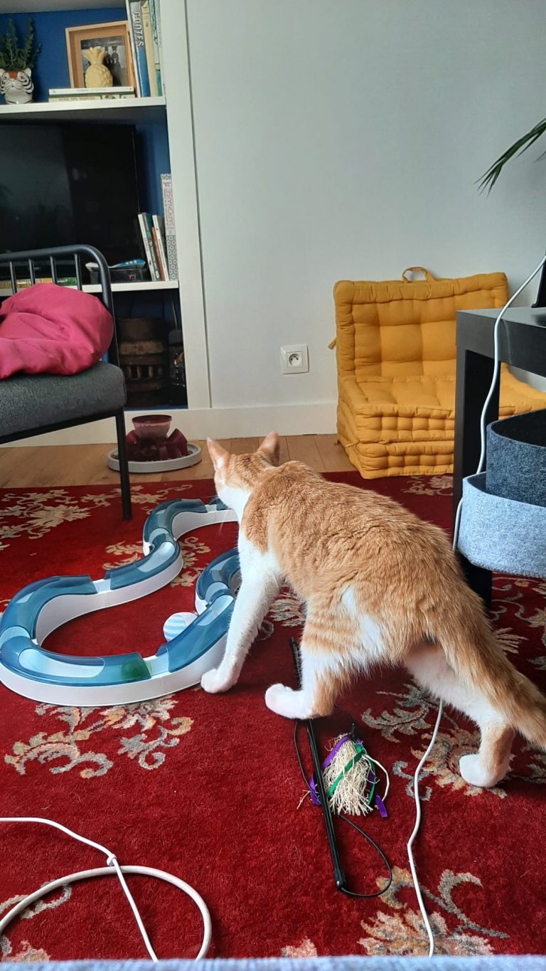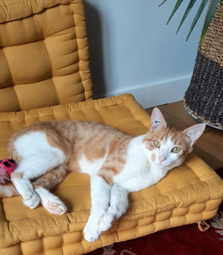 Voici ce que dit sa famille d'accueil : "Okapi est vraiment un chat super sympa, joueur et câlin. Les bruits et mouvements imprévus le font sursauter mais ça s'améliore de jour en jour. Il se laisse brosser facilement, le coupage des griffes est plus ardu mais j'ai trouvé une technique qui fonctionne. Il mange bien les croquettes et réclame sa pâté le matin"