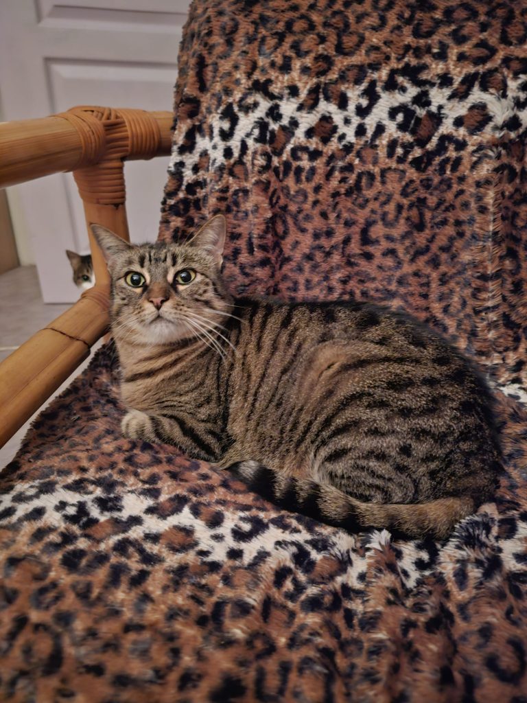 Cette minette de 6 ans a été trouvée errante par une bénévole, qui l'a accueillie chez elle avec ses 4 chatons et qui lui en a confié 3 de plus sauvés de l'euthanasie. Elle s'est courageusement occupé de ses 4 bébés jusqu'à leurs adoptions, mais elle n'a pas eu la chance d'avoir une famille d'accueil de socialisation et elle est donc restée très craintive avec les humains.