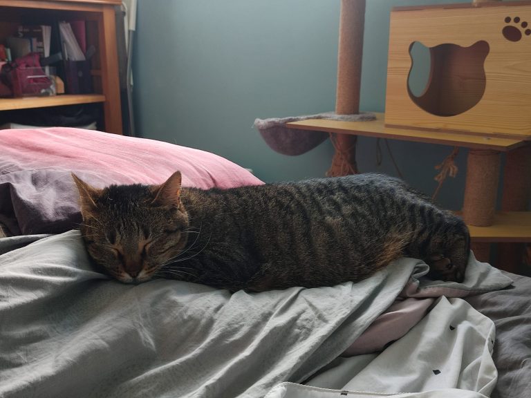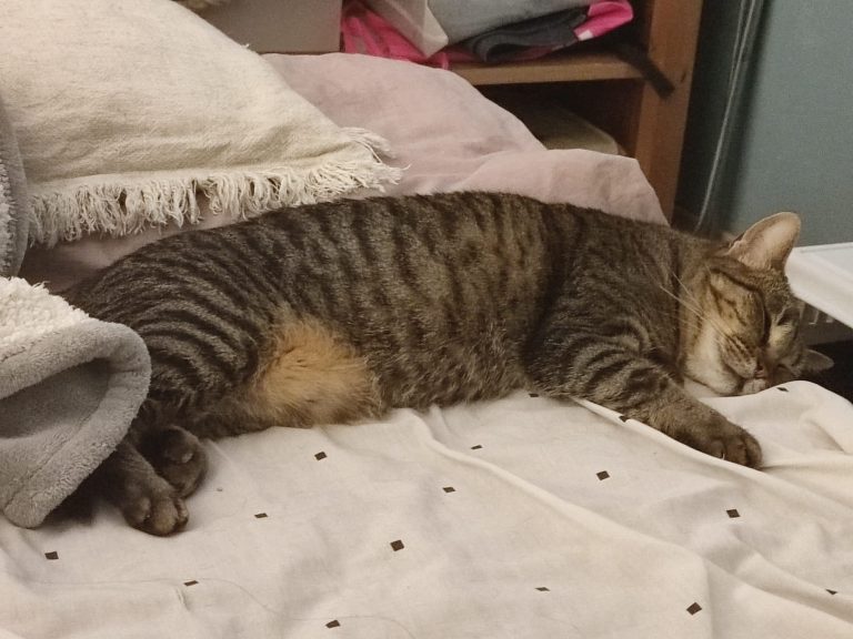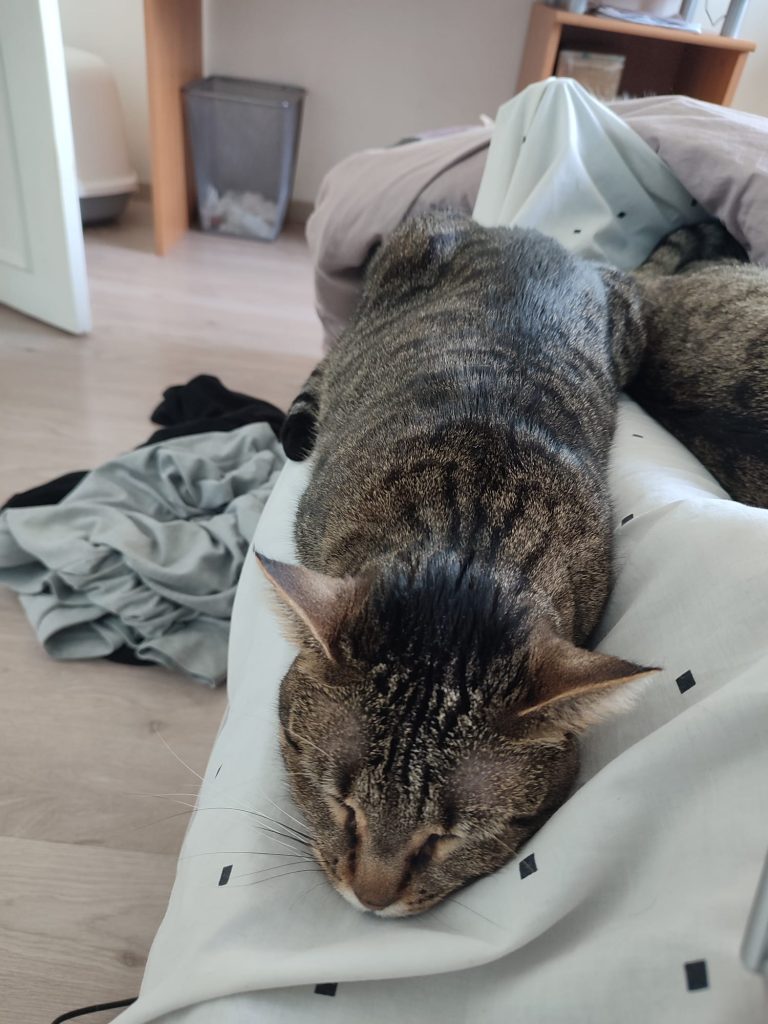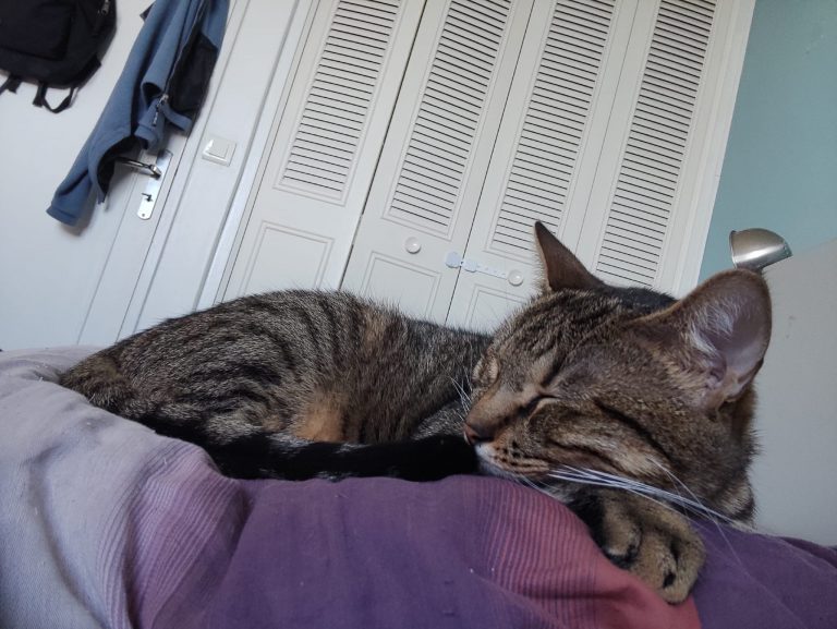 C'est une mamie (bien qu'elle ne soit probablement pas très vieille). Elle est très calme et passe la plupart du temps à se reposer. Elle aime beaucoup les caresses et vient en réclamer quand elle n'en a pas assez. Elle dort la plupart du temps sur le lit, à nos pieds. Elle a un miaulement de chaton, c'est très mignon. Elle va quand-même avoir ses coups de folie pendant 5 minutes de temps en temps où elle va courir partout et sauter comme un chaton.