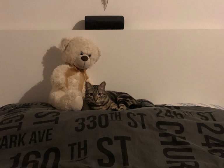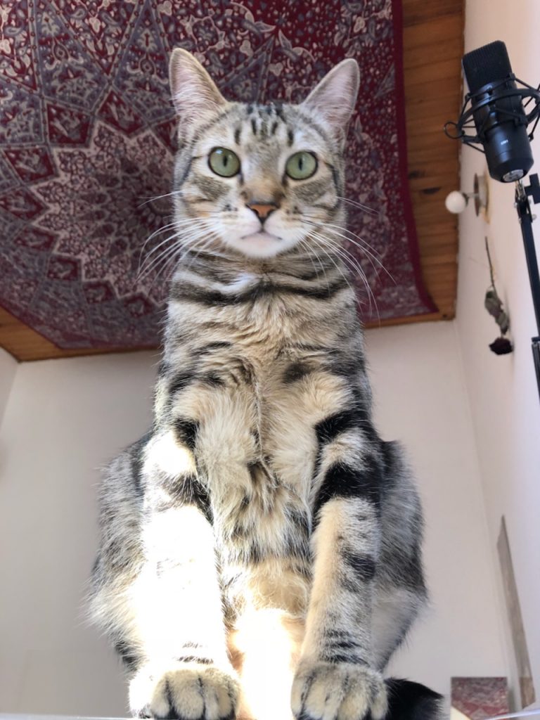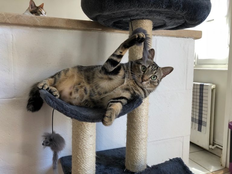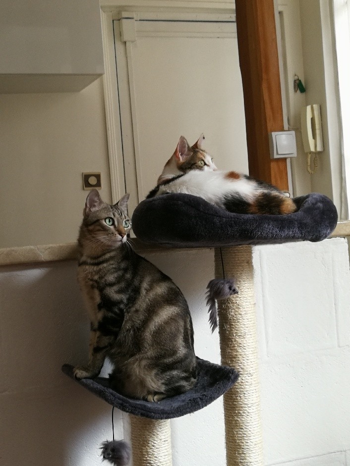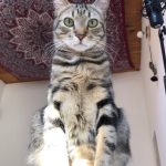 Mais il compense le fait d’être très craintif par sa maladresse absolument charmante. Il a deux fractures à la queue, ce qui le rend très maladroit. Du coup, il tombe, il se rate un peu, et c’est assez mignon et touchant à voir. De plus il a du mal à miauler ce qui se remarque par des petits sons aigues qu’il émet difficilement.